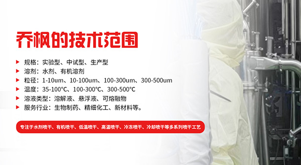 上海喬楓實業有限公司,成立于2012年,是從事噴霧干燥設備的研發設計、生產、銷售(小型噴霧干燥機,實驗型噴霧干燥機,35℃低溫噴霧干燥機有機溶劑噴霧干燥機低溫閉式循環噴霧干燥機超細粉末噴霧干燥機噴霧冷凍干燥機、真空噴霧干燥機氣流噴霧干燥機噴霧造粒干燥機,離心噴霧干燥機,沸騰制粒機等)和售后于一體的綜合性公司,本公司現成為一家致力于為生物制藥、精細化工、新能源、陶瓷造粒及食品工程等領域提供全套解決方案的整線交鑰匙工程企業。